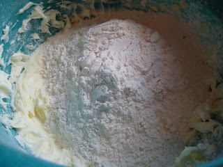 For the crust: beat the butter and then add the powdered sugar and then the flour. Press into the bottom of a jelly-roll sized pan (I usually use a size thats a little smaller than that, but I didn't have the pan since it held the ::Nutter Butter Balls:: that I gave awway). Bake at 300 degrees for about 20-25 minutes. Cool.